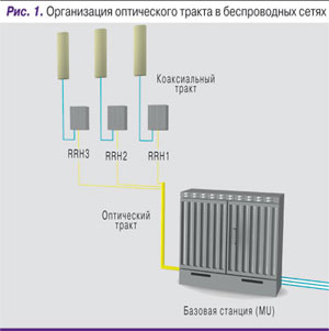 В системах FTTA используется распределенная архитектура – основной блок (MU – Main Unit) располагается в контейнере базовой станции и отвечает за взаимодействие с контроллерами базовых станций и центрами коммутации; подключение антенных групп к оптическому тракту осуществляется посредством выносных радиомодулей (RRH – Remote Radio Head) (рис. 1).