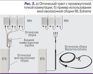 Разумной альтернативой описанным подходам может стать применение кабельных систем с промежуточной точкой коммутации (рис. 5, а). В этом случае от базовой станции прокладывается многоволоконная сборка (например, с 6 или 8 волокнами) до промежуточной коммутационной коробки, расположенной в непосредственной близости от модулей RRH (как правило, на расстоянии от 5 до 15 м).