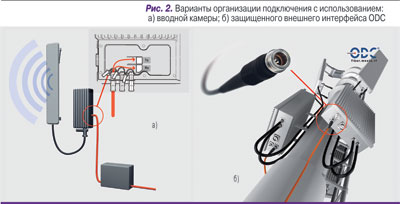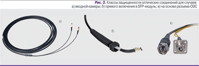 Присутствие влаги и пыли в воздухе может привести к возникновению загрязнений в оптическом интерфейсе, поэтому возникает необходимость в герметизации соединения. Вариант реализации с вводной камерой при применении обычных интерфейсов LC обеспечивает требуемый класс IP67 вне зависимости от аккуратности выполнения монтажных работ (рис. 3, а). Некоторые производители оборудования базовых станций отказались от вводной камеры из-за сложностей при монтаже и предлагают вариант прямого включения в порты SFP-модуля, где место соединения дополнительно защищается резиновыми хвостовиками (класс IP54), как, например, на рис. 3, б. Использование оптического внешнего разъема ODC (рис. 3, в) позволяет обеспечить класс защиты IP68 при сохранении удобства монтажа и стойкости соединения к внешним механическим и температурным воздействиям.