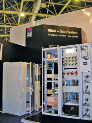 Rittal проводит 2010 г. под лозунгом Rittal – Das System, который подчеркивает, что компания предлагает системные решения, охватывающие весь диапазон продуктов для ИТ-систем заказчиков и услуг по их проектированию, монтажу, вводу в эксплуатацию и обслуживанию. На «Связь-Экспокомме-2010» была представлена базовая платформа TS 8 для модульных корпусов, позволяющая создавать гибкие решения под разные требования. В разделе электрораспределительного оборудования демонстрировался новый трехфазный ИБП PMC 40 мощностью 10–40 кВт, предназначенный для установки в 19-дюймовые стойки в шкафы глубиной 800 мм. Новая система охлаждения LCP Inline для ЦОДов позволяет отводить со стойки до 30 кВт тепла. При использовании воды повышенной температуры (17°C вместо 12°C) она дает экономию электроэнергии до 55% за счет увеличения доли естественного охлаждения оборудования. Управлять всей ИТ-инфраструктурой ЦОДа Rittal предлагает с помощью ПО RiZone. На небольшие компании ориентированы мини-ЦОДы – комплексные решения под ключ, обеспечивающие физическую защиту от пожара, воды, коррозийных газов и взлома. В них установлены модульные ИБП, системы охлаждения, мониторинга и пожаротушения. Rittal также предлагает микроЦОД, который является, наверное, самым маленьким защищенным дата-центром в мире: в сейфе имеется ИБП, система контроля микроклимата и место высотой 15U для установки серверов или систем хранения данных. Система охлаждения за неимением места внутри располагается на шкафу сверху.