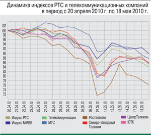В результате за период с 15 апреля по 14 мая индекс ММВБ потерял 11,69%, упав до отметки 1352,01 пункта, а индекс РТС снизился на 14% до уровня 1441,68 пункта. Динамика котировок акций компаний телекоммуникационного сектора определялась в целом негативной ситуацией на отечественном фондовом рынке; тем не менее отраслевые индексы биржевых площадок выглядели несколько лучше «широкого» рынка. Так, отраслевой индекс «ММВБ телекоммуникации» (MICEX TLC) за месяц потерял 12,55%, до 1937,38 пункта, а индекс «РТС Телекоммуникации» (RTStl) снизился на 13,31%, до 203,32 пункта.Ключевым событием на рынке телекоммуникаций стало официальное объявление коэффициентов конвертации акций МРК и цены выкупа акций «Ростелекома» у акционеров, не согласных с реформированием холдинга «Связьинвест». Совет директоров «Ростелекома» принял решение включить в повестку дня общего собрания акционеров (которое состоится 26 июня) вопрос о реорганизации «Ростелекома» в форме присоединения к нему семи МРК, а также «Дагсвязьинформа». Цена выкупа акций «Ростелекома» у акционеров, не согласных с реформой, оказалась одинаковой для обыкновенных и для привилегированных акций и составляет 86,21 руб. за одну бумагу. Официальное объявление коэффициентов обмена и цен выкупа подтвердило поступавшую ранее неофициальную информацию, что привносит в процесс реорганизации «Связьинвеста» определенность и предсказуемость. Следует также отметить, что за прошедший месяц большинство компаний телекоммуникационного сектора провели закрытие реестра и обозначили дату проведения годового собрания акционеров для определения размера дивидендов по итогам 2009 г.
