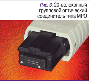 Для поддержки функционирования 40- и 100-гигабитных много-модовых оптических интерфейсов, использующих схему параллельной передачи, помимо модульно-кассетных решений, необходимы групповые соединители типа МРО. Сегодня промышленностью серийно выпускаются групповые соединители, рассчитанные на 8 и 20 волокон (рис. 3).