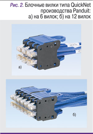 Один из ключевых компонентов модульно-кассетных решений – это групповые разъемы. Они наиболее востребованы в ЦОДах и аппаратных крупных СКС, где требуется большое количество претерминированных сборок. В настоящее время подобные изделия активно используются в той части СКС, которая выполняется на симметричном кабеле. Среди таких разработок следует отметить решения AMP (ARJ21) и Mo-lex (ModLink). Компания Panduit предлагает два варианта изделий QuickNet, ориентированных на подключение коммутаторов к СКС (рис. 2).