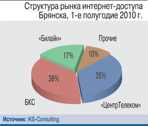 По оценкам iKS-Consulting, количество интернет-пользователей «ВымпелКома» в Брянске в конце 1-го полугодия 2010 г. достигло 13 тыс., что вывело его на третье место на рынке ШПД Брянской области. Первенство же в этой дисциплине ожидаемо удерживает «ЦентрТелеком» с более чем 50 тыс. интернет-абонентов. Но если за пределами Брянска конкурентов у «ЦентрТелекома» практически нет, то в самом городе традиционный монополист не выдерживает давления. Здесь его с первого места оттеснил оператор «Брянские кабельные сети» (БКС), который работает на рынке с 2002 г. и основной бизнес которого – предоставление услуг КТВ и интернет-доступа. К июлю 2010 г. количество подписчиков услуги доступа в Интернет у БКС достигло 28 тыс., а у «Центр-Телекома» – порядка 26 тыс.