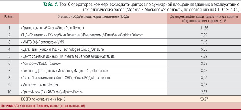 По состоянию на 01.07.2010 г. в Московском регионе действовало более 90 КЦОДов, владельцами которых выступали более 70 операторов. Десятка крупнейших операторов КЦОДов (по суммарной площади введенных в эксплуатацию технологических залов) приведена в табл. 1.