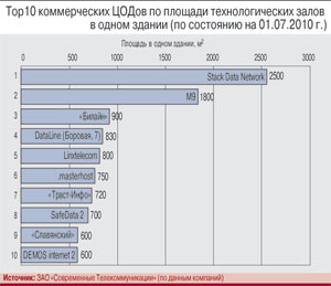 Многие из компаний попали в число лидеров по показателю суммарной площади благодаря вводу в коммерческую эксплуатацию крупных дата-центров или их залов в 2009 г. Это «ДатаЛайн», «Мастерхост», «СВС-связь» («Славянский»), «Демос-Интернет», «Комкор» (перечислены в порядке убывания площади дата-центров, введенных в 2009 г.).