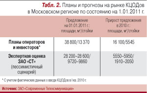 Доля дата-центров, в которых по состоянию на 01.01.2010 г. можно было разместить/арендовать стойку, составляла 50%. На тот момент в Московском регионе пустовало примерно 1200 стоек, или 15% от их общего числа. В IV кв. 2009 г. – I кв. 2010 г. многие участники московского рынка КЦОДов «уточнили» свои планы в сторону снижения темпов развития, но зато несколько новых игроков анонсировали крупные инвестиционные проекты. Оценка общего предложения на рынке коммерческих дата-центров в Московском регионе с учетом объявленных планов операторов (инвесторов) представлена в табл. 2.