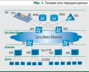 Магистраль Metro Ethernet. Основная задача данного уровня – агрегация трафика и надежная его доставка в соответствии с вышеперечисленными требованиями от уровня предоставления сервиса (PoP) до уровня доступа и обратно. В большинстве современных операторских сетей в качестве транспортного протокола на сети Metro Ethernet используется IP/MPLS. Для агрегации трафика служит технология VPLS/HVPLS.Уровень доступа (сеть FTTB). Основные задачи данного уровня – обеспечение пользователям услуг triple play доступа к телематическим сервисам, агрегация трафика пользователей, транспорт трафика до пограничных коммутаторов магистральной сети Metro Eternet и обратно.