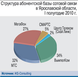 В структуре телеком-доходов доминирует сотовая связь, ее доля в общем котле в первом полугодии составила почти 45%. На рынке Ярославской области работает не только «большая тройка», но и еще два игрока – GSM-старожил СМАРТС и местный филиал «ЦентрТелекома», который по договору со «Скай Линком» предоставляет услуги в стандарте IMT-MC 450 под брендом последнего. Всего сотовики обслуживают в регионе более 1,65 млн абонентов, что соответствует проникновению сотовой связи в 126% (по сим-картам).