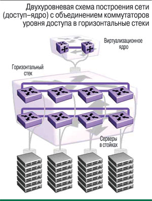 Объединение коммутаторов уровня доступа в высокоскоростной горизонтальный стек снижает потребность в числе uplink-каналов, служащих для подключения к коммутаторам уровня распределения (distribution) и/или ядра сети (core). Более того, такой стек может взять на себя функции, традиционно выполняемые коммутаторами уровня распределения, что позволяет перейти от трехуровневой (доступ–распределение–ядро) к двухуровневой (доступ–ядро) структуре сети (см. рисунок). Для этого, правда, необходимо более скоростное подключение стека к ядру, но с учетом того, что сегодня выпускаются модели стековых коммутаторов, которые поддерживают скорость 10 Гбит/с, это не представляет особых сложностей. Такое упрощение структуры сети означает сокращение числа единиц сетевого оборудования, а, следовательно, снижение капитальных затрат и расходов на обслуживание.