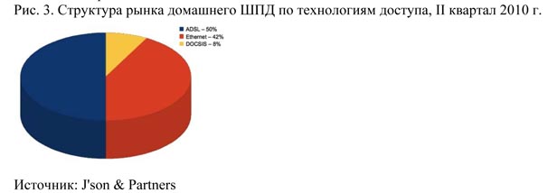 За период со II квартала 2009 г. по II квартал 2010 г. доля ADSL-подключений в России увеличилась на 7 процентных пунктов. По мнению J'son & Partners, это обусловлено, во-первых, тем, что в условиях сокращения инвестиционных программ в 2008-2009 гг. провайдеры, развивая свои сети в регионах, отдавали предпочтение сравнительно недорогому ADSL, не требующему строительства отдельной сетевой инфраструктуры. Во-вторых, в последнее время МРК «Связьинвеста», предоставляющие доступ в Интернет в основном по технологии ADSL, показывают высокие темпы роста абонентской базы (за 2009 г. - на 38%), что не могло не сказаться на увеличении доли ADSL-подключений в России.