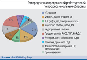 Бессменный лидер последних двух лет по количеству вакансий, предлагаемых работодателями, – сфера информационных технологий. Из этой профессиональной области в 2009–2010 гг. поступило в 2 раза больше заявок, чем из индустриального комплекса и сферы маркетинга, рекламы, медиа и PR; в 3 раза больше, чем из агропромышленного комплекса и сырьевого сектора; в 4 раза больше, чем из сферы логистики, транспорта и ВЭД и в 5 раз больше, чем из области административного персонала, HR и юриспруденции (см. рисунок).
