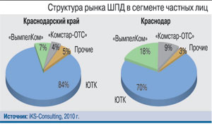 В столице края, Краснодаре, ШПД развивается оживленнее. Благодаря присутствию интернет-провайдеров федерального масштаба, «ВымпелКома» и «Комстар-ОТС», 25% домохозяйств города имеют выделенные интернет-линии. Оба оператора пришли на кубанский рынок в результате поглощения региональных игроков: «ВымпелКом» – краснодарских компаний «Кубтелеком» и «Кубинтерсвязь» и сочинской «Сочителеком», «Комстар» объединил региональные активы «Стрим-ТВ» и ЦТС. Два года операторы занимались оргпроцессами и строительством сетей; в нынешнем году следует ожидать усиления их маркетинговой активности, что в конечном счете должно увеличить долю альтернативных операторов на региональном рынке ШПД. А потенциал его далеко не исчерпан, стоит только учитывать, что из-за большого количества малоэтажной застройки в городах края очень популярен мобильный Интернет, уже в какой-то степени составляющий конкуренцию проводным сетям.