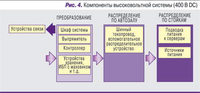 Для внедрения систем распределения на 400 В DC требуется преобразование электропитания и использование распределительных компонентов для серверных стоек и ЦОДа в целом. Как и в случае с распределением переменного тока, существует множество способов распределения постоянного тока. Основной способ таков: модуль преобразования электроэнергии (выпрямитель) соединяется с устройствами накопления энергии, затем электропитание распределяется по залам и далее – на уровне серверных стоек (рис. 4). Для передачи электроэнергии от центрального узла (помещения для оборудования электропитания) или от шкафа электропитания, расположенного в помещении серверных стоек, могут применяться различные комбинации элементов. Центральное распределение электропитания требует наличия общей распределительной инфраструктуры на большой площади, в то время как при «точечном» распределении используется небольшая распределительная сеть и требуется наличие аккумуляторных батарей, расположенных на серверном этаже, вблизи потребителей.