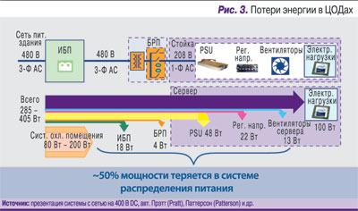 С ростом использования информационных систем растет количество и масштаб центров обработки данных. Так, только в 2004–2009 гг. в среднестатистическом ЦОДе число серверных стоек выросло в 4–10 раз. Для владельцев ЦОДов главными трудностями стали увеличение плотности электроэнергии и рост ее потребления. После 2007 г. в отрасли был внедрен ряд инициатив по повышению эффективности использования энергии. Однако эти оптимизационные меры практически не затронули системы электропитания. Поскольку чистое, бесперебойное питание жизненно важно для работы ЦОДов, владельцы этих объектов неохотно внедряют решения или технологии, которые могут поставить под угрозу их функционирование. Тем не менее общепризнанно, что традиционные системы распределения питания (48 В постоянного тока (DC) и 208 В переменного тока (AC)) имеют недостатки, которые можно минимизировать за счет использования альтернативных конфигураций и высокоэффективных компонентов без снижения надежности систем.