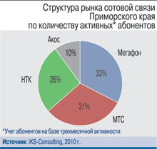Соседство со странами Азиатско-Тихоокеанского региона сильно сказывается на экономике Приморья: предприятия с иностранным капиталом работают практически во всех отраслях, и телеком – не исключение. Вплоть до нынешнего года крупнейшим региональным оператором с иностранным капиталом являлась «Новая телефонная компания», а ее основным акционером – корейский телекоммуникационный холдинг KT Corporation. Покупка им в декабре 1997 г. контрольного пакета акций НТК повлияла не только на становление самого оператора, но и на развитие связи края в целом. В течение нескольких лет оператор успешно выдерживал конкуренцию с федеральными игроками – МТС и «МегаФоном». В июне 2011 г. была достигнута договоренность о приобретении НТК «ВымпелКомом». Последний долгое время не имел доступа в Приморье из-за отсутствия частот в стандарте GSM и лишь в 2009 г., после получения лицензии на строительство сети 3G, обозначил свое присутствие на этом рынке. Купив НТК, «ВымпелКом» вошел в тройку лидеров сотовой связи Приморья. Четвертый мобильный оператор региона – АКОС, работающий в стандарте GSM 1800. Контрольный пакет его акций принадлежит «Ростелекому».