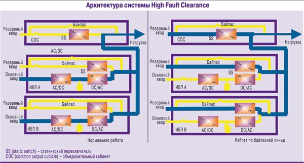 Существует и третья архитектура параллельных систем ИБП – high fault clearance, HFC (автор с коллегами так и не придумали адекватного русскоязычного термина. Если хорошие идеи возникнут у читателя, прошу поделиться). В системе с архитектурой HFC соединены возможности подключения к резервной линии: при помощи объединительного кабинета со статическим и ручным байпасами на всю мощность системы и по резервным вводам в каждом ИБП.