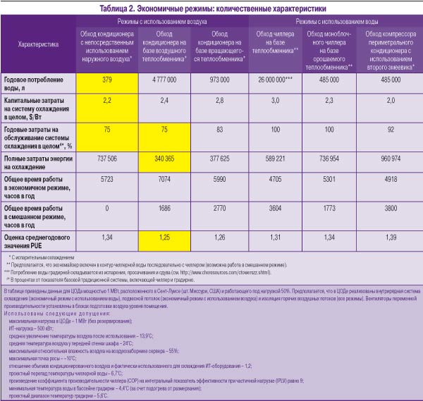 Напомним, что во 2-й части статьи мы выбрали из 15 возможных типов экономичных режимов те, для которых выполняются два условия: возможна работа в смешанном режиме, с пониженной нагрузкой на компрессор, и поддерживается испарительное охлаждение. Для шести выбранных режимов мы провели сравнительный анализ с учетом качественных характеристик. Теперь сравним те же режимы по ряду количественных характеристик (табл. 2); лучший по каждому показателю режим выделен цветным фоном.