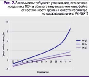 На рис. 2 приведены результаты расчетов выходной мощности передатчика, которая требуется для получения на приеме отношения сигнала к шуму в 22 дБ. Видно, что при протяженности тракта до 30 м для функционирования медножильных трансиверов требуется заметно меньшая электрическая мощность; наращивать ее приходится только после порогового значения. (При проведении расчетов принимали fв = 1,2fн, где fв – верхняя граничная частота полосы пропускания кабельного тракта, fн – частота Найквиста линейного сигнала.)