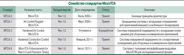 Базовая спецификация MTCA.0 была утверждена в 2006 г. В иерархической структуре стандартов PICMG эта спецификация фигурирует как дополнение к стандарту PICMG 3.0 – базовой спецификации AdvancedTCA. Кроме того, в MTCA.0 отдельно оговорено полное соответствие стандарту AMC.0 – общему для модулей AMC. Спецификация MTCA.0 образует фундамент для реализации систем MicroTCA, включая механические, электрические и термальные параметры их основных компонентов, а также интерфейсы, механизмы взаимодействия систем и работу подсистемы электропитания. Этого достаточно для создания решений офисного класса, используемых в качестве периферийных составляющих телекоммуникационных инфраструктур. Чтобы удовлетворить растущий интерес заказчиков со смежных рынков (промышленности, оборонного комплекса, энергетики и т.д.), потребовалась разработка вариантов стандарта, адаптированных к более жестким условиям эксплуатации.