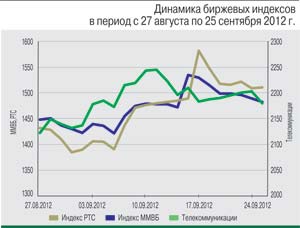 Период с 25 августа по 25 сентября российские индексы завершили со следующими результатами: индекс РТС вырос на 5%, достигнув отметки 1510,96 пункта, а индекс ММВБ прибавил 2% – до 1482,61 пункта. Отраслевой индекс «ММВБ телекоммуникации» за рассматриваемый период вырос на 2,53%, до отметки 2179,99 пункта.