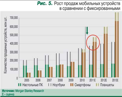 По данным ООН, в конце 2011 г. население Земле перевалило за 7 млрд. Число же пользователей мобильной связи в мире компания Ericsson в своем отчете Traffic and market data report (февраль 2012 г.) оценила в 4,1 млрд (а за счет того, что многие являются абонентами сразу нескольких операторов, общее число «мобильщиков» приближается к 6 млрд). Все они потенциальные интернет-пользователи, поскольку доступ в Интернет через мобильную сеть постепенно становится преобладающим. В последнем квартале 2011 г. мобильных интернет-терминалов (смартфонов и планшетов) впервые было продано больше, чем фиксированных (настольных ПК и ноутбуков, включая нетбуки) (рис. 5).