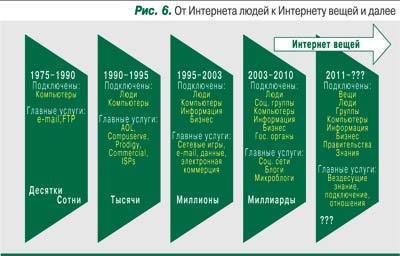 В результате Интернет станет Интернетом вещей (Internet of Things, IoT) (рис. 6). И дальнейший его рост будет происходить именно за счет Интернета вещей. Все вещи на Земле будут подключены к Сети и будут обмениваться информацией через нее. Чип в любой продукт будет встраиваться уже на этапе производства. Покупая молоко в супермаркете, мы будем смотреть на свой смартфон, проверяя срок годности продукта. А стоя в холодильнике, молочный пакет сам сообщит нам, что молоко внутри уже испортилось, если мы его не допили.
