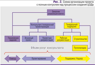 Самостоятельное управление всем процессом расширяет границы наших возможностей, но приводит к повышению рисков и увеличению загрузки собственных экспертных ресурсов – которые, как известно, заняты и другими задачами, связанными с сопровождением существующих ИТ-систем. Структурная схема организации проекта, представленная на рис. 2, напротив, позволяет получить полный контроль над процессом создания комплекса ЦОДа и в то же время задействовать минимальный ресурсный пул собственных экспертов.