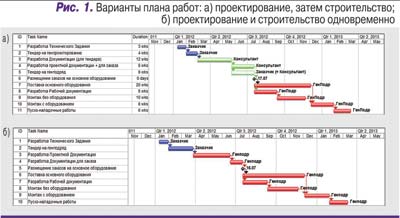 Рассмотрим два плана работ: первый – проектирование, затем строительство; второй – проектирование и строительство одновременно. Как видно из рис. 1, сроки окончания работ по обоим вариантам практически совпадают. Однако риски во втором варианте гораздо выше.
