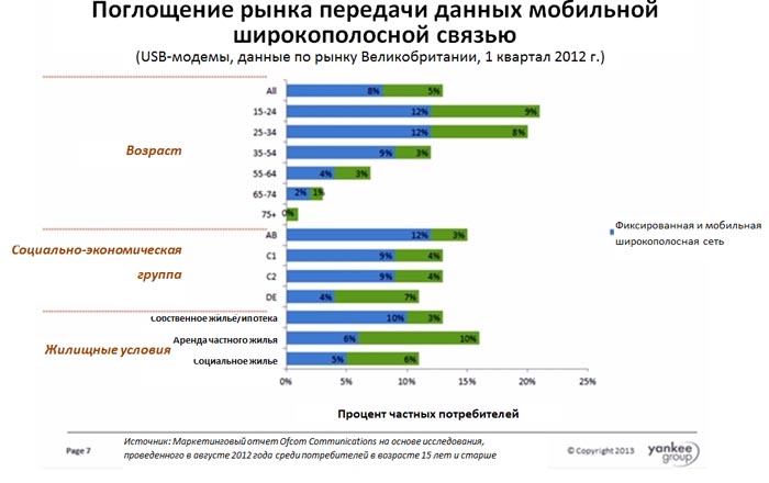 «Молодые люди с более низким уровнем дохода скорее предпочтут мобильную широкополосную связь», - утверждает Суэйн, ссылаясь на исследования, проведенные Yankee Group в США и аналитической компанией Ofcom в Великобритании (см. диаграмму ниже). Чем моложе респондент, тем чаще он использует мобильную широкополосную сеть. И чем респонденты беднее (см. строчку «DE» - неквалифицированные рабочие + низшие слои населения), тем чаще они используют мобильную широкополосную сеть. Мобильной широкополосной сетью активнее пользуются и те, кто снимает жилье.