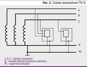 • «система TN-S – система TN, в которой нулевой защитный и нулевой рабочий проводники разделены на всем ее протяжении» (рис. 2);