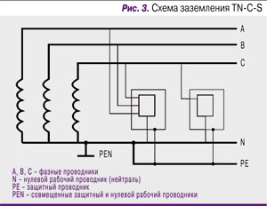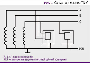 • «система TN-С – система TN, в которой нулевой защитный и нулевой рабочий проводники совмещены в одном проводнике на всем ее протяжении» (рис. 1);