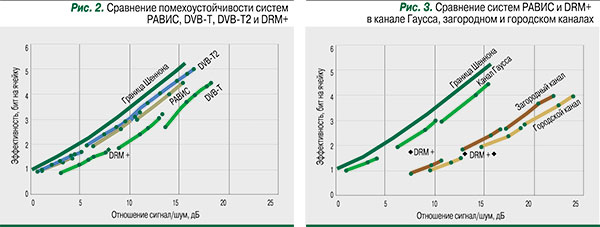 Реализованное в системе канальное кодирование в потоке до 900 кбит/с при наличии гауссовских помех обеспечивает ее помехоустойчивость практически на границе Шеннона аналогично передаче телевизионной информации по внедряемому в России стандарту DVB-T2 (рис. 2). Однако в отличие от телевизионных систем и систем широкополосного доступа, используемые методы кодирования, узкополосность системы и ее организация в ОВЧ-диапазоне гарантируют квазибезошибочный прием информации при многолучевом канале связи в городском и загородном движении приемника (со скоростями 60 и 150 км/ч) (рис. 3).
