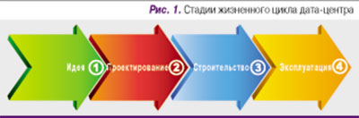 В общем случае жизненный цикл – это совокупность взаимосвязанных процессов последовательного изменения состояния объекта, от начала формирования исходных требований к нему до окончания его эксплуатации. Состояние объекта изменяется последовательно, и эта последовательность имеет четко выраженный стадийный характер. В жизненном цикле объекта применительно к ЦОДу можно выделить следующие стадии (рис. 1): >идея; > проектирование; > cтроительство; > эксплуатация.