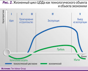 С финансовой точки зрения жизненный цикл ЦОДа характеризуется ростом капитальных затрат, пик которых приходится на первую половину стадии строительства, с выходом в равновесную точку на том этапе эксплуатации, когда первоначальные затраты окупаются и ЦОД начинает приносить прибыль. По достижении заданного срока эксплуатации ЦОДа стоимость поддержания объекта в надлежащем состоянии начинает превышать извлекаемую из него прибыль, т.е. появляются убытки.