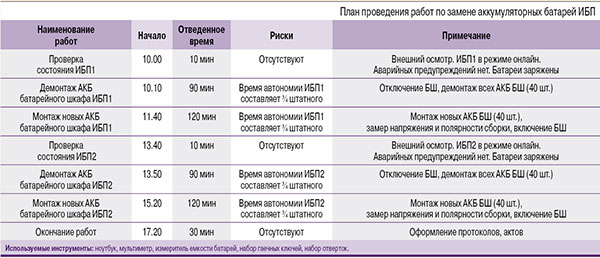 Посмотрим, как может выглядеть подобный план для работ, к примеру, по замене аккумуляторных батарей на двух источниках бесперебойного питания (см. таблицу).