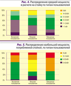 На основе полученных в ходе опросов данных Uptime Institute попытался выявить связи между удельной потребляемой мощностью и типами пользователей, обслуживаемых ЦОДом, – внутренними или внешними. Внутренние пользователи – это одно или несколько подразделений компании-цодовладельца; внешние пользователи не являются частью компании-владельца. Оказалось, что в 64% ЦОДов, работающих только с внутренними пользователями, средняя мощность в расчете на стойку не превышает 2 кВт, а у 61% ЦОДов, имеющих дело только с внешними пользователями, средняя мощность в расчете на стойку составляет 2 кВт и выше. В ЦОДах смешанного типа данный показатель находится в диапазоне 2–3 кВт (рис. 4).