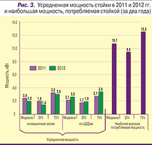 Этот показатель определяли двумя способами. Первый предусматривал осреднение мощности, потребляемой ИT-устройствами в стойках, по машинным залам и по ЦОДам в целом и давал среднюю мощность стойки. Второй предполагал выявление в ЦОДе одной стойки с наибольшей потребляемой мощностью.