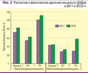В 2012 г. медиана расчетной удельной мощности составила 840 Вт/кв. м, увеличившись по сравнению с 2011 г. на 108 Вт/кв. м. При этом средние 50% значений этого параметра укладывались в диапазон 630–1120 Вт/кв. м. Медиана фактической удельной мощности составила 450 Вт/кв. м (рост по сравнению с 2011 г. – 11 Вт/кв. м), а средняя половина ее значений находилась в диапазоне 330–580 Вт/кв. м. (рис. 2). Несколько небольших по масштабу ЦОДов были специально спроектированы в расчете на высоконагруженные стойки, у них расчетная удельная мощность превышала 1600 Вт/кв. м. Охваченные опросом ЦОДы используют 59% доступной им мощности, причем средние 50% ЦОДов потребляют 42–73% доступной мощности (рост по сравнению с 2011 г. – 5%).