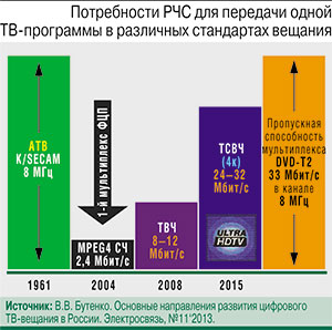 Сегодня в нашей стране полным ходом осуществляется переход на цифровое эфирное вещание, пока в режиме передачи программ стандартного качества, хотя телевидение высокой четкости уже стало необходимостью. Ведь трудно себе представить, что социально значимые программы для населения навсегда останутся стандартного качества. Но для перехода к ТВЧ нужны частотные ресурсы. На горизонте маячит телевидение сверхвысокой четкости, а это еще дополнительные ресурсы (см. рисунок).