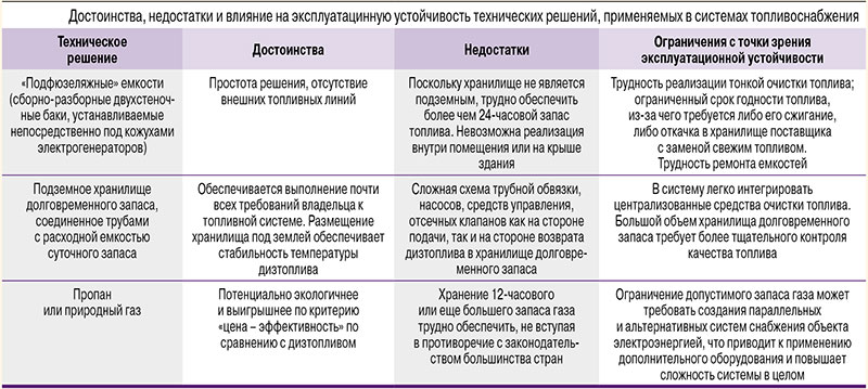 Ответы на эти вопросы должен дать владелец ЦОДа, который должен четко определить, какие цели ставятся, когда речь идет об обеспечении автономности работы дата-центра. Исходя из его ответов и учитывая требования стандарта Tier Standard: Topology и принципы уменьшения риска в рамках обеспечения эксплуатационной устойчивости, проектировщики разрабатывают систему хранения и доставки топлива (достоинства, недостатки и влияние на эксплуатационную устойчивость некоторых технических решений см. в таблице).