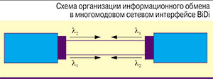 С инженерной точки зрения технология BiDi интересна в первую очередь тем, что при передаче на короткие расстояния одновременно используется два инженерных приема, прежде широко применявшихся в сетях связи общего пользования и при построении линий доступа на участке последней мили. Речь идет о технике спектрального разделения информационных потоков, передаваемых во встречных направлениях, причем технике, реализуемой в экономически привлекательном для передачи на небольшие расстояния спектральном диапазоне 850 нм. Этот прием сочетается с двунаправленной передачей по одному световоду, а также с увеличением быстродействия отдельного субканала до 20 Гбит/с (см. рисунок). Комплекс мероприятий при разработке дает возможность сохранить традиционную 2-волоконную схему организации связи на скорости 40 Гбит/с.