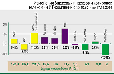 | С 15 октября по 17 ноября индекс ММВБ вырос на 9,4% (до 1507,1 п.), а долларовый индекс РТС упал на 5,9% (до 1004,13 п.). Отраслевой индекс «ММВБ телекоммуникации» вырос почти на 11% (до 2013,25 п.). |