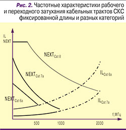 Из представленных выше данных следует, что достижение требуемой величины ACR за счет наращивания NEXT заметно эффективнее. Проиллюстрируем это положение на численном примере. При переходе с техники категории 5е на категорию 6 шаг скрутки уменьшается на несколько десятков процентов. В конструкцию кабельного сердечника в подавляющем большинстве случаев дополнительно вводится сепаратор. Комплекс этих достаточно простых по современным меркам мероприятий дает возможность добиться увеличения NEXT на отмеченные выше 10 дБ. Кроме того, наращивание NEXT оказывается одинаковым во всем рабочем частотном диапазоне. Вносимые потери IL уменьшаются за счет увеличения диаметра токопроводящей жилы пары с 0,51 до 0,53 мм. Абсолютная величина снижения согласно требованиям стандартов составляет примерно 2 дБ на частоте 100 МГц, т.е. выигрыш по этому параметру от перехода на более качественную элементную базу оказывается достаточно малым. Более того, по мере уменьшения частоты величина выигрыша падает, что еще более снижает эффективность наращивания пропускной способности кабельного тракта этим путем.
