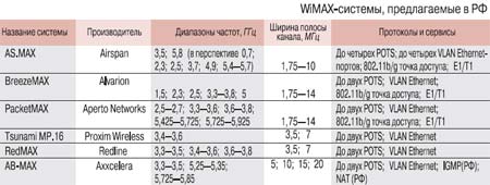 С другой стороны, неплохо чувствуют себя конкуренты – традиционные системы BWA на базе оборудования WiMAX-класса (другие частоты и нет сертификации WMF), Wi-Fi в применении сервисов BWA, будущие системы 802.11n (в комбинации с mesh-доступом), а также технология DSL. Системы 3-го поколения подвижной связи становятся реальностью на Западе, да и у нас появились лицензиаты. Поэтому картина выжидающего рынка вырисовывается весьма отчетливо, пользователи прикидывают, чье решение обойдется дешевле при аналогичных функциях, и, «зомбированные» заветным словом, не спешат покупать и устанавливать. Но производителей WiMAX на российском рынке меньше не становится (таблица). Более того, появляются и новые представительства, например Redline и Edge-Core.