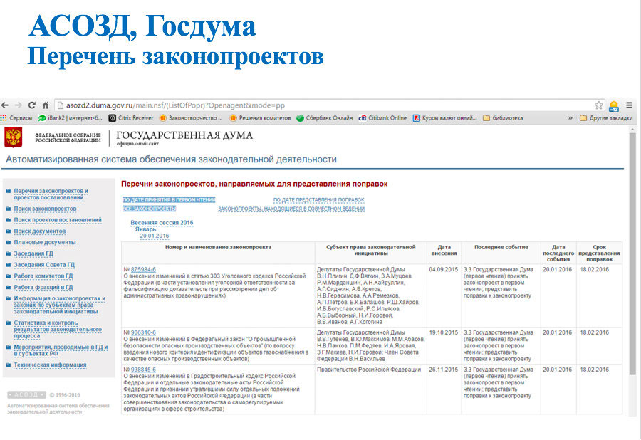 - Работа с паспортами законопроектов (создание паспортов, наполнение их документами, стадии рассмотрения).