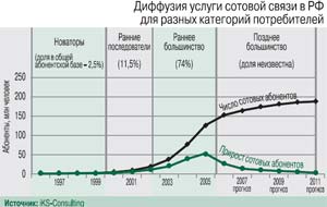 Процесс принятия рынком новшества имеет форму S-образной кривой. Спрос на новинку вначале растет медленно, затем ускоряется, а потом снова замедляет свой рост, стремясь к какому-то пределу. Как показывает мировой опыт распространения высокотехнологичных услуг, время принятия high-tech-услуги рынком – не менее 15 лет. Например, радио принималось рынком порядка 18 лет, черно-белый телевизор и видеоплееры – 15 лет, персональные компьютеры – 20 лет. В разных странах рынок неодинаково быстро реагирует на инновации, что обусловлено влиянием социально-экономических факторов.