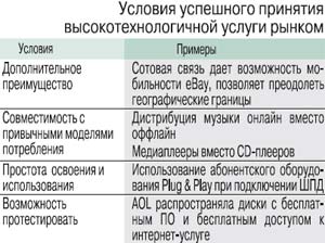 4. Чем проще услуга в освоении, тем быстрее она принимается рынком. Наблюдавшийся в 2005 г. на российском рынке спад мобильного контента был обусловлен в том числе накопленным абонентами негативным опытом пользования контент-услугами (который, в свою очередь, обусловлен неумением пользоваться WAP и GPRS), отсутствием настроек в телефонах, а также техническими проблемами доставки контента у операторов или контент-провайдеров. Именно поэтому поставщики high-tech-продукта стараются максимально упростить процесс его использования. Например, после либерализации британского рынка дальней связи воспользоваться услугами нового альтернативного оператора дальней связи Mercury можно было только при наборе специального префикса. Рассматривая дополнительные цифры в номере как конкурентный недостаток, компания договорилась с производителями телекоммуникационного оборудования о производстве телефонного аппарата с синей кнопкой, при нажатии на которую код доступа набирался автоматически.