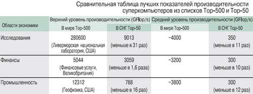 Позиции отечественных суперкомпьютеров в мировых рейтингах для гражданских применений, увы, вызывают озабоченность и заставляют бить тревогу. Из таблицы, составленной на основе последней редакции мирового суперкомпьютерного рейтинга Тор-500 (www.top500.org) и шестой редакции рейтинга самых мощных компьютеров СНГ Тор-50, видно, что Россия в этой области отстает, и значительно.