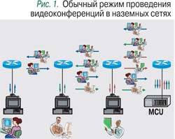 - при передаче от центра к удаленным точкам – широковещательная (мультикаст) передача одного видеопотока (в некоторых случаях двух) ко всем удаленным точкам и его преобразование для передачи конкретным терминалам ВКС в каждой конечной точке;